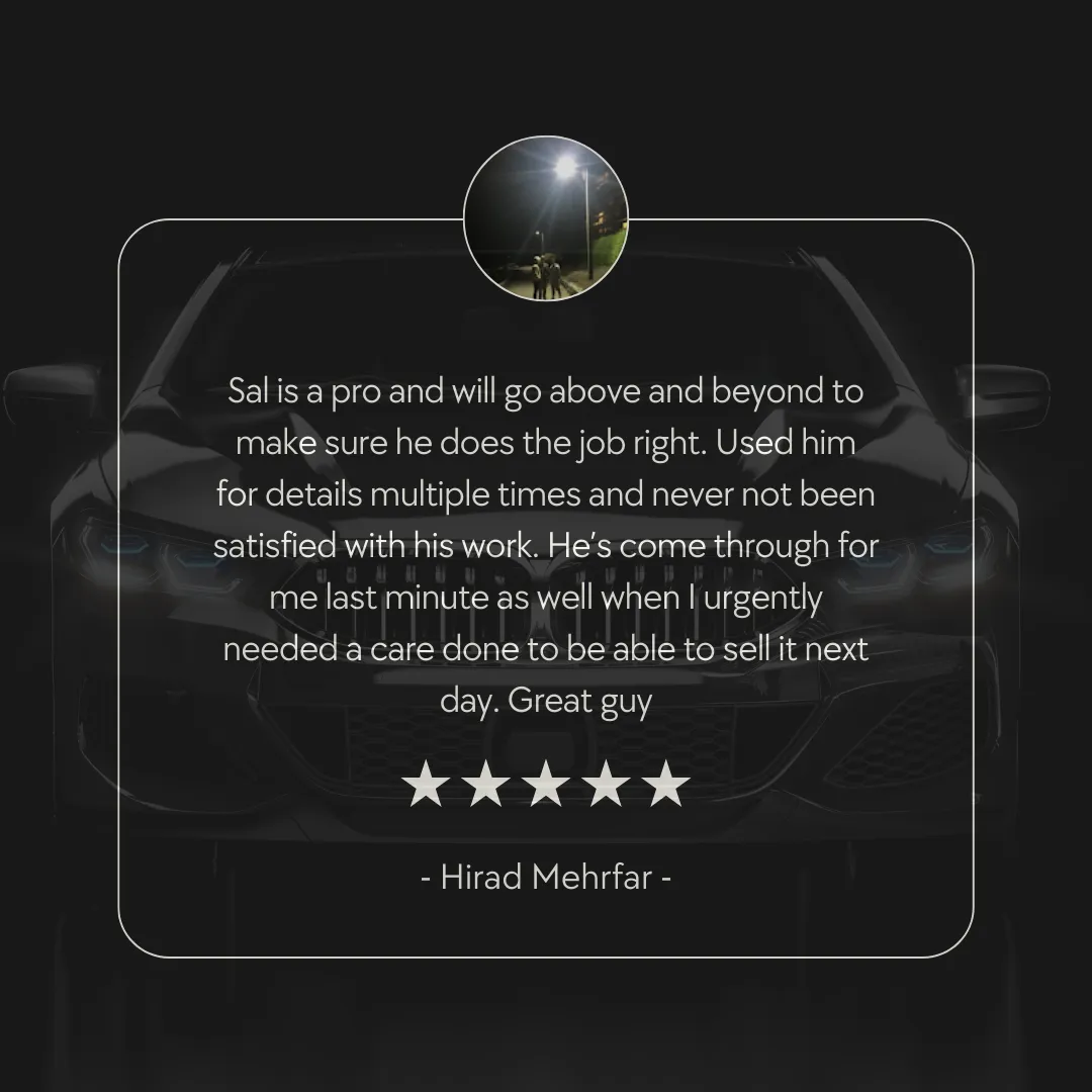 Started Sal's Detailing in the year 2017, since then he has been providing excellent service to his clients and setting standards of his own. He's known to be one of the best ceramic coater's in town. Call him a perfectionist as he truly is. He's known for providing his clients with the right advice and helping people make the right choice for their priced possession. He is always introducing new things to help his clients get an even better service.